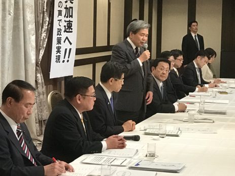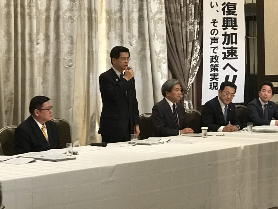 石井啓一 国土交通大臣、蒲島郁夫 熊本県知事を迎えて熊本市内のホテルで”熊本地震の復興加速へ!!” のテーマで開催。震災後の対応や今後の課題を確認し、「これからも被災者に寄り添う支援に全力を」と参加者全員で確認し合いました。